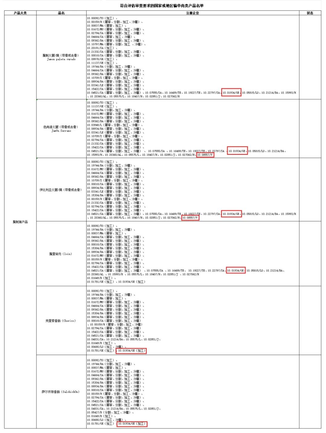 1. 新增西班牙2家(注册编号为:10.08557/V、10.01934/GE)腌制猪肉企业自2025年8月19日及之后生产的符合中国要求的腌制猪肉产品输华。