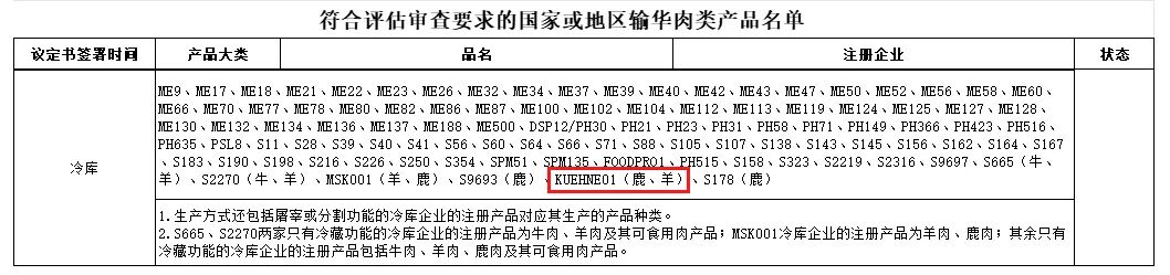 3. 新增新西兰1家(注册编号为:KUEHNE01【冷库】)羊肉企业自2025年8月19日及之后贮存的符合中国要求的肉类产品输华。