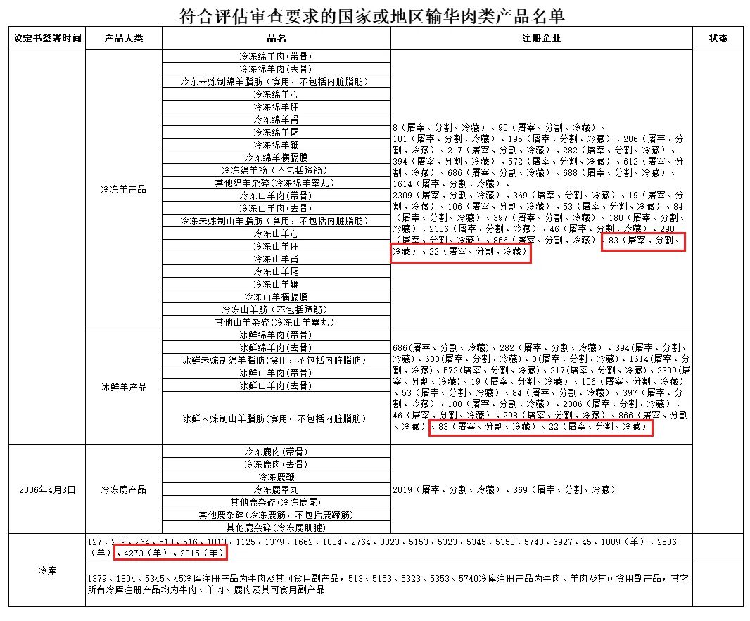 2. 新增澳大利亚企业(注册编号为:83、22、4273【冷库】、2315【冷库】)羊肉企业自2025年8月19日及之后生产的符合中国要求的羊肉产品输华。