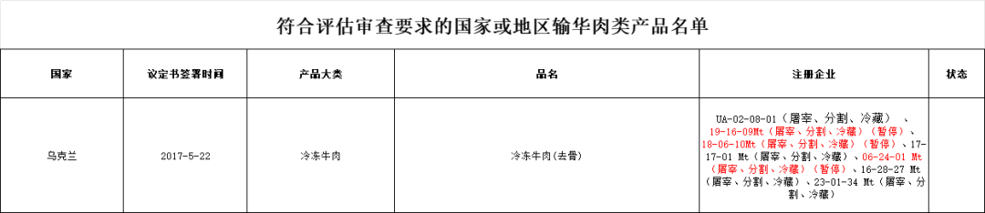 1. 暂停受理乌克兰牛肉企业(注册编号为:06-24-01 Mt、18-06-10Mt、19-16-09Mt)自2025年9月8日(含)起启运的输华肉类产品进口申报。