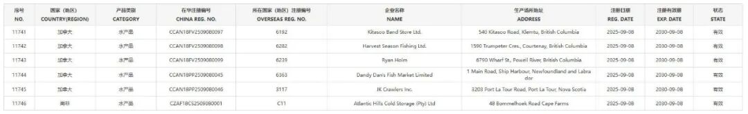 1. 新增加拿大5家水产品企业输华注册,(注册编码为:6192、6282、6239、6363、3117)自2025年9月8日及之后生产的符合中国要求的水产品允许输华。