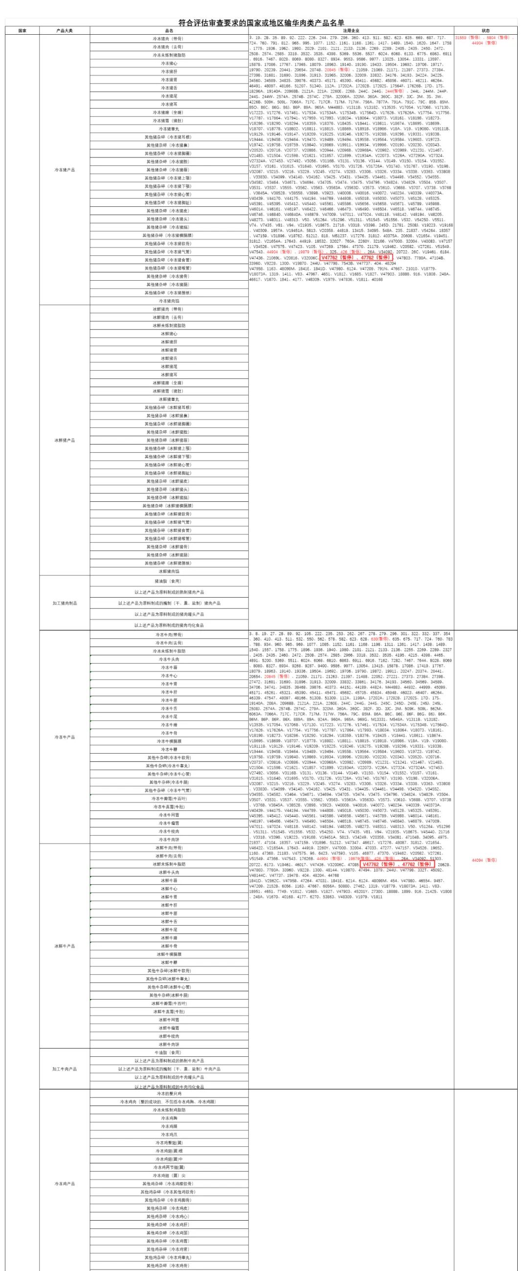 1. 暂停受理美国注册编号为V47762、47762、P47762的输华肉类产品进口申报。