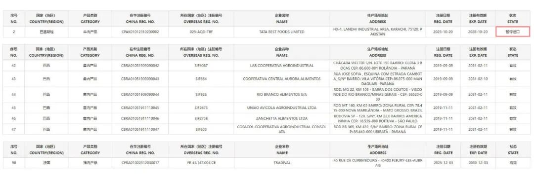 DATA UPDATE 进口食品境外生产企业注册名单 2025年12月3日更新 1. 暂停受理巴基斯坦1家牛肉产品企业(注册编号为:025-AQD-TBF)自2025年11月29日(含)起启运的输华肉类产品进口申报。 2. 恢复巴西6家禽肉产品企业(注册编号为:SIF4087、SIF664、SIF926、SIF2675、SIF2758、SIF603)的输华肉类进口申报。 3. 新增法国1家猪肉产品企业(注册编号为:FR 45.147.004 CE)自2025年12月3日及以后生产的输华肉类进口申报。